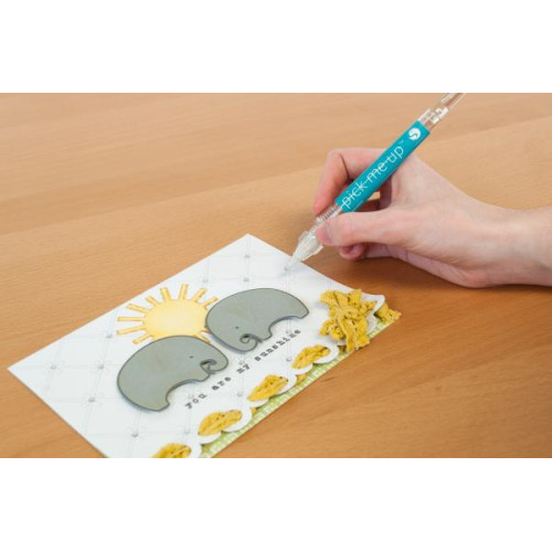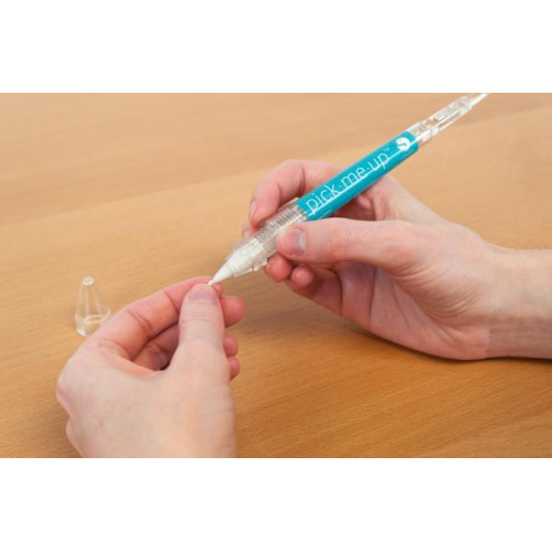 Ve špičce toho pera je umístěna gumová lepící hmota, která lehce přichytí malé části, které potřebujete přesně umístit. Pokud přestane lepit, špička se ustřihne a šroubovacím závitem se znovu vysune nová guma. Na opačném konci pera je umístěn hrot pro jemné posouvání objektů.