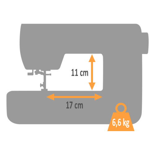| Extra velká pracovní plocha vpravo od jehly | 17 cm | 17 cm | 17 cm | 17 cm | 22,5 cm | 28 cm | 28 cm |