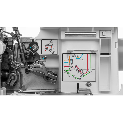 Levý i pravý přední kryt se dají otevřít, což umožní úplný přístup k prostoru kličkařů, což velmi usnadňuje navlékání nití.