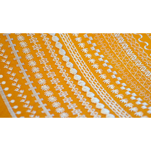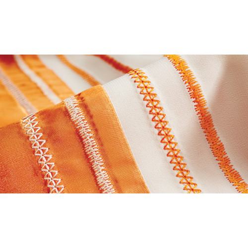 100 druhů stehů, na stroji je zabudovaná tabulka stehů. Jednoduše si tabulku vysunete, vyberete steh a nastavíte. Potom tabulku zase zasunete. Velmi praktické a přehledné. Najdete zde stehy pro rovné šití, quilting, overlockové, okrasné, atd.