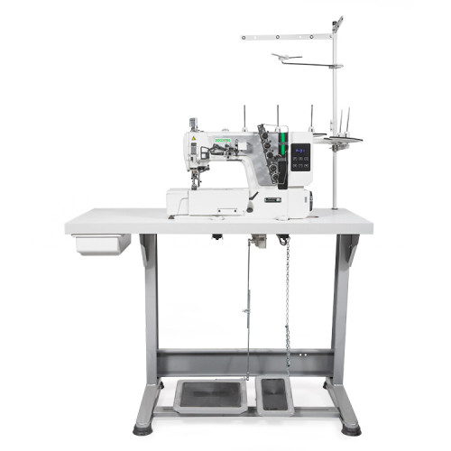 3-jehlový, 5-nitný interlock plochý pro lehké a střední materiály. Součástí je zabudovaný servomotor v hlavě stroje, který snižuje vibrace stroje. Rozpich jehel je 5,6 mm, zabudované diferenciální podávání, spodní a horní krytí s možností vypnutí horního krytí, max. rychlost šití je 5.000 stehů/min, centrální mazání. Kompletní šicí stroj s deskou a stavcem Kessler.