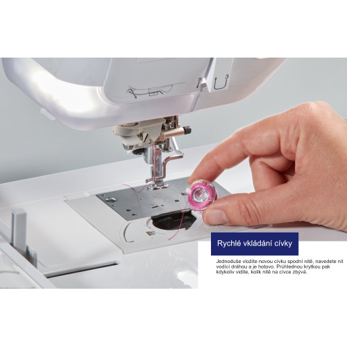 Stroj nám umožňuje vyšívat a zároveň navíjet cívku. Je to díky nezávislému navíječi cívek.