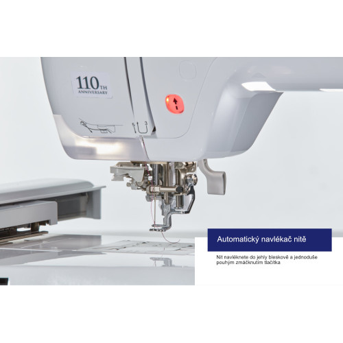 Co opravdu oceníte je elektronický plně automatický navlékač jehel. Pouhým stiskem tlačítka jednoduše a rychle navlečete nit do jehly. Při vyšívání vícebarevné výšivky je to nepostradatelný pomocník.