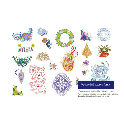 Vyšívací stroj má celkem 227 vestavěných vyšívacích motivů, včetně moderních designů, klasických japonských výšivek, květinové abecedy a dalších.