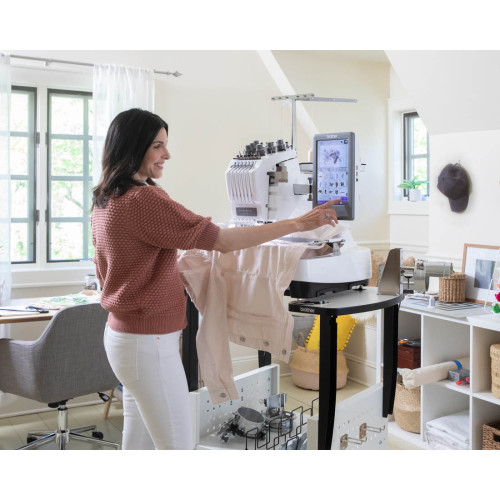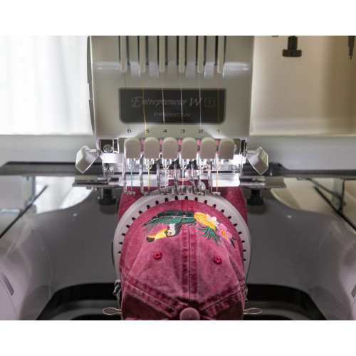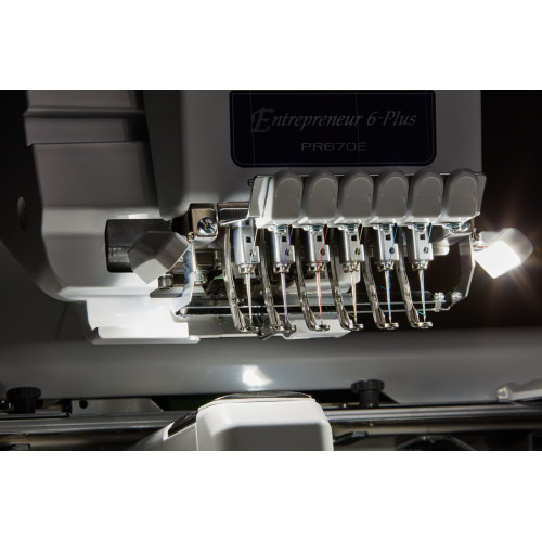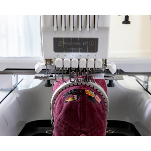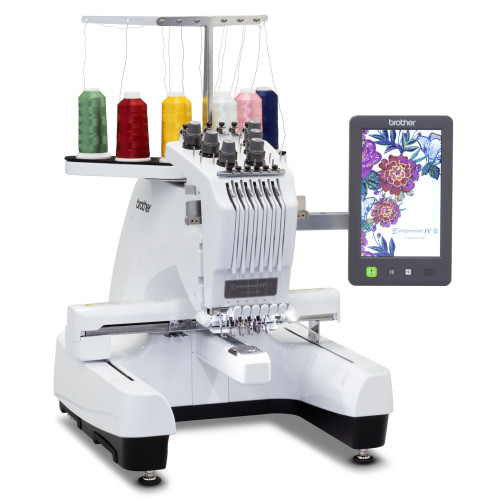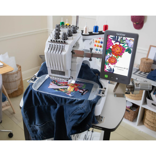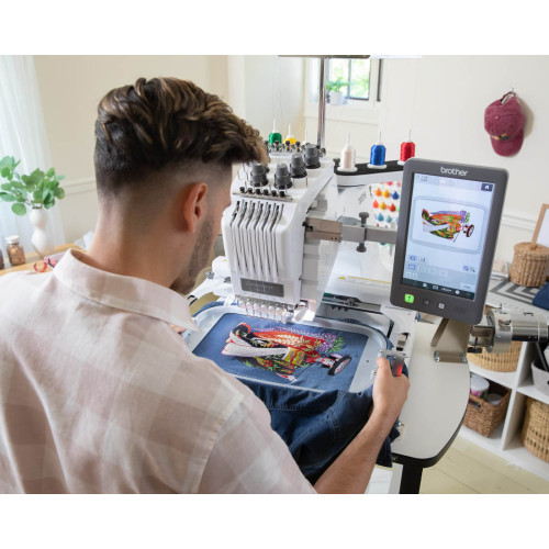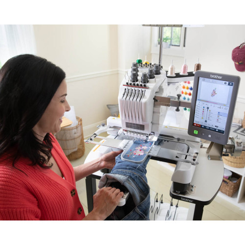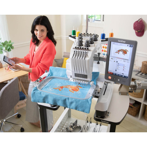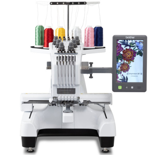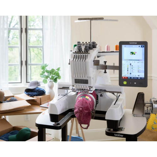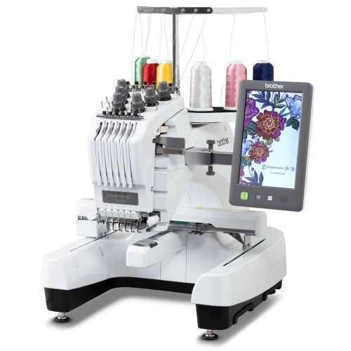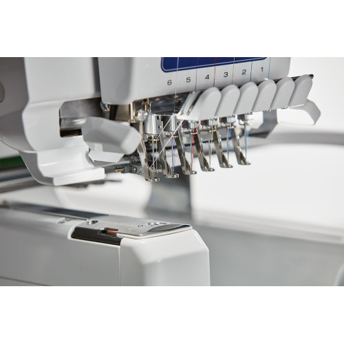 Kompaktní šestijehlový profesionální vyšívací stroj s úzkým ramenem japonské firmy Brother.