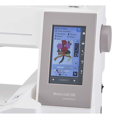 Elektronické vyšívací stroje Janome MC 550 E Limited Edition jsou řízené počítačem a jsou určené výhradně pro vyšívání. Stroje Janome MC 550 E LE jsou vybavené rotačním chapačem, automatickým navlékáním nitě, intuitivním barevným LCD displejem a USB portem. Vyšívací stroje MC 550 E LE nabízí kvalitu šití příznačnou pro stroje Janome, včetně vynikajících vyšívacích funkcí. Oproti modelu MC 500 E má MC 550 E LE o 20 více zabudovaných vzorů a větší vyšívací plochu 200 x 360 mm (oproti 200 x 280 mm).