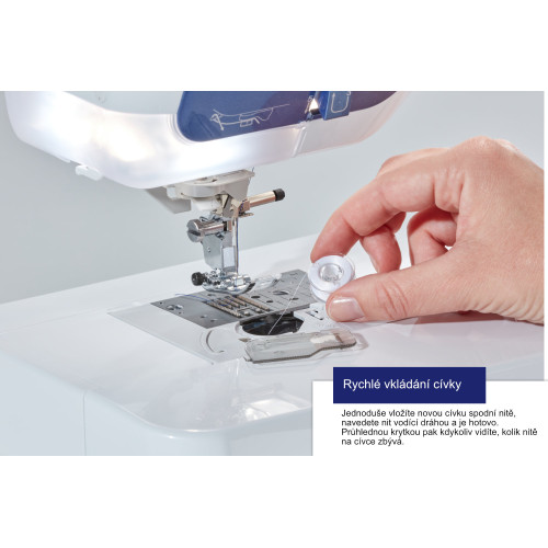 Průhledná patka poskytuje optimální přehled zejména při šití vrchních ozdobných švů na líci látky. P..