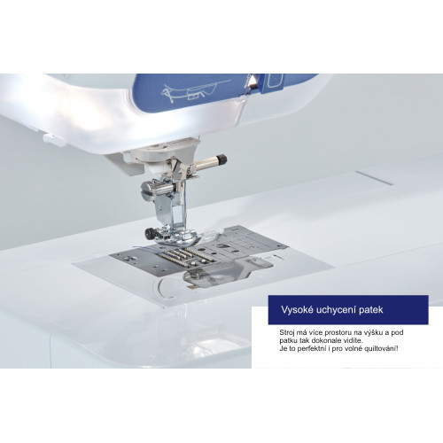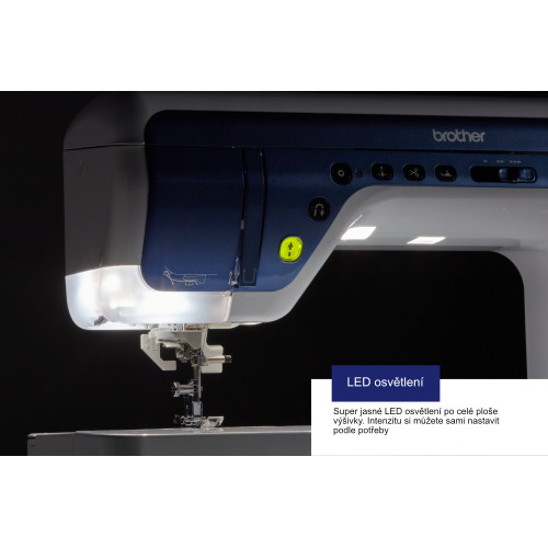 Prostor 28,5 cm od jehly k tělu stroje vás prostě dostane - už nebudete mít problém s quiltováním velkých dek, vyšíváním obrovských ubrusů nebo bund. Brother V5 má oproti nižším modelům více prostoru i na výšku - má vysoké uchycení patek a prostor pod ramenem je opravdu velkorysý. Svícení pomocí 6 LED světel je téměř nezničitelné, intenzitu světla si můžete nastavit podle sebe, na šití perfektně uvidíte a šetříte svoje oči!