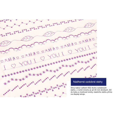 Pro šití a zdobení máte k dispozici 652 druhů šicích stehů, z nichž mnoho je až 40 mm širokých díky stranovému podávání. Stroj umí podávat i vlevo, vpravo a po úhlopříčce. Na navlečené nohavici ušijete čtvereček. Pokud si z předdefinovaných stehů nevyberete, můžete si během chvilky na displeji stroje naklikat svůj vlastní steh! Rychlost šití je 1050 stehů za minutu, což oceníte zvláště u quiltování.
