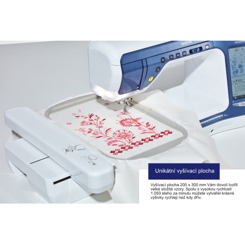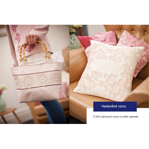 Kombinace šicího a vyšívacího stroje šetří vaše peníze, pro vyšívání máte k dispozici vyšívací plochu 20x30 cm a rychlost 1050 stehů za minutu, takže se nemusíte bát vyšívat i plošné velké výšivky. Stroj má v paměti připraveno 224 vyšívacích vzorů (vyberte si ze stylu vintage, moderní výšivky, japonské kaligrafické motivy, monogramy nebo klasické květinové vzory), dále pak volíte ze 140 druhů orámování, 17 druhů vyšívacích fontů abecedy a samozřejmě můžete do stroje pomocí USB flash disku nebo kabelu dát jakoukoliv výšivku, kterou si vytvoříte nebo stáhnete z internetu.