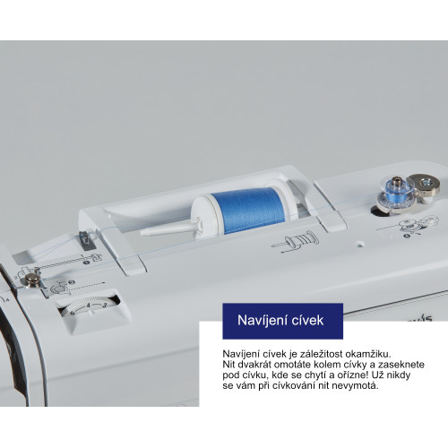 Navíjení cívek je záležitost okamžiku. Nit dvakrát omotáte kolem cívky a zaseknete pod cívku, kde se chytí a ořízne!