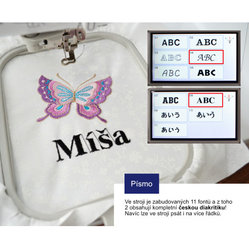 Fantastická novinka jsou české fonty přímo v paměti stroje. Na vyšití jmen obsahujících Ž nebo Š už nebudete potřebovat software.