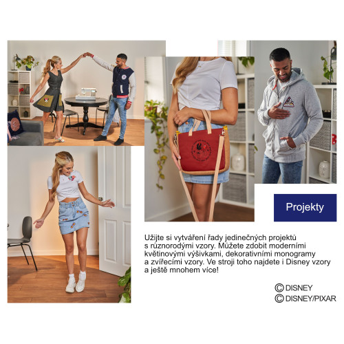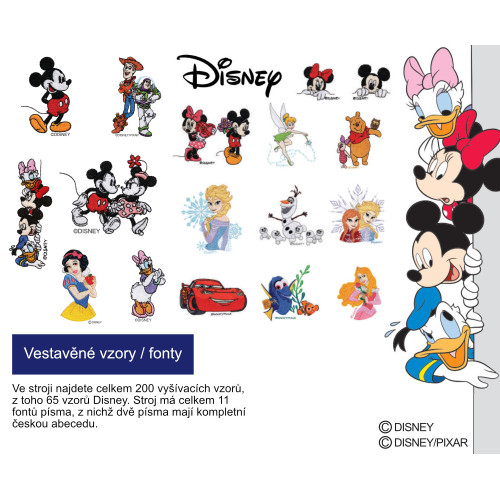 Máte k dispozici celkem 200 vyšívacích vzorů v paměti stroje. Z toho je 65 Disney vzorů.