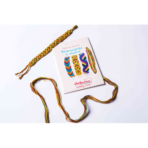 KIT pro tvorbu náramku přátelství. Náramek si vyrobíte sami pomocí speciální techniky makramé. Sada obsahuje bavlnky Ariadna MOULIN, instrukce na 3 vzory náramku. Sady jsou v různých barevných kombinacích (k dispozici až 24 kombinací bavlnek). Sady zasíláme náhodným výběrem barev.