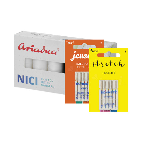 Sada pro šití pletenin pro šicí stroje skládající se z nití a jehel.