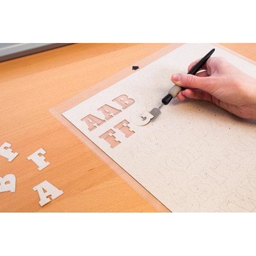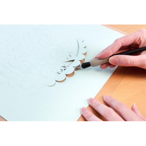 Pomůcka pro odloupnutí vyřezaných vzorů z řezací podložky. Pomocí této pomůcky lze bez porušení sloupnout i jemné motivy.
