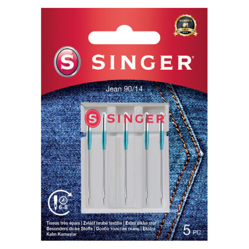 Jehly na džínovinu mají ostrou špičku a zesílené tělo jehly. Ta se díky tomu neláme a nepřeskakují stehy.