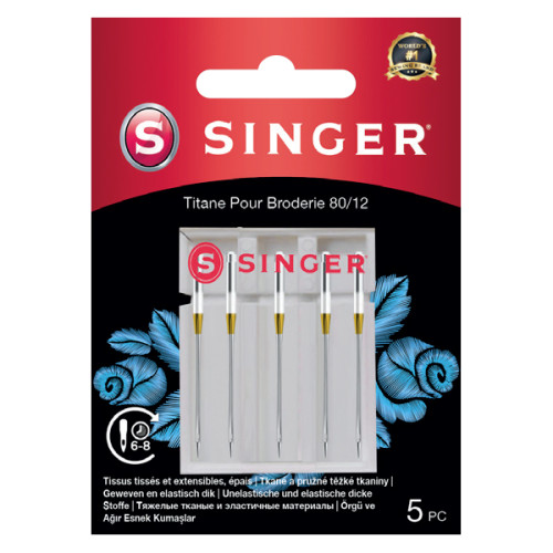 Titanové jehly na vyšívání mají vlastnosti jako vyšívací jehly - mají zvláštní zkosení, lehce zaoblený hrot a o něco větší oko, aby se nepoškodila nit, ani látka. Povrch je titanový, odolává lepidlům, zajišťuje menší opotřebení jehly a lépe proniká hrubými a hustě tkanými látkami.