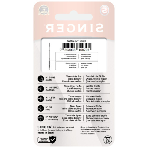Metallic (pro metalické nitě - bez barevného označení), Quilting (pro quiltování - fialové označení), Universal (universální na všechny tkaniny - červené označení), Overlock 14SH (pro overlocky - bez barevného označení), Microtex (pro mikrovlákno, hedvábí - černé označení), Jeans (pro džínovinu - modré označení), Leather (pro kůži a koženku - hnědé označení), Hemstitch (pro obrubování - bez barevného označení), Embroidery (pro vyšívací stroje - bílé označení), Stretch (pro pleteniny - žluté označení, Overlock 14U (pro overlocky - bez označení).