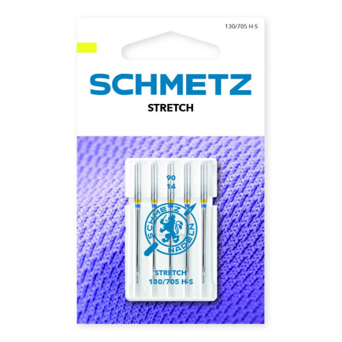 Stretchové jehly (H-S) mají speciální skosení, které brání přeskakování stehů v případě napětí látky. Pro úplety, plavky, fleece, syntetický semiš a kůži.