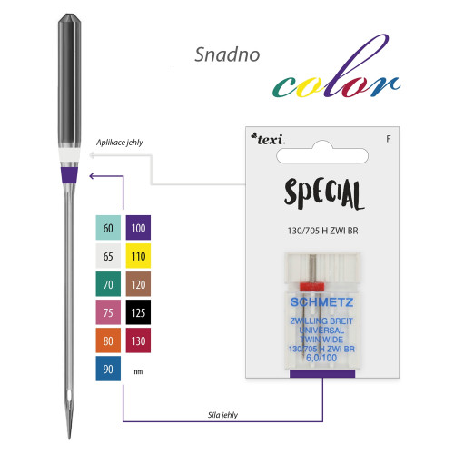 Dvojjehla pro dekorativní stehy Texi, šíře mezi jehlami 6,0 mm, síla jehel 100. Tyto jehly jsou určeny pro většinu domácích šicích strojů a slouží k začištění okraje materiálu, nebo jako náhrada krycího stehu cover (dvojitý spodní steh). Používají se pro nejběžnější typy látek a materiálů.