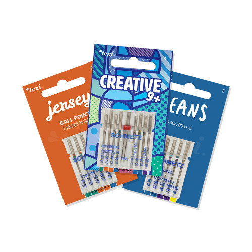 Texi set jehel Schmetz 130/705 H je set 3 ks nejprodávanějších balení jehel od německé značky Schmetz pro domácí šicí stroje. Tyto kvalitní jehly s ploškou jsou vhodné pro většinu šicích strojů do domácnosti.