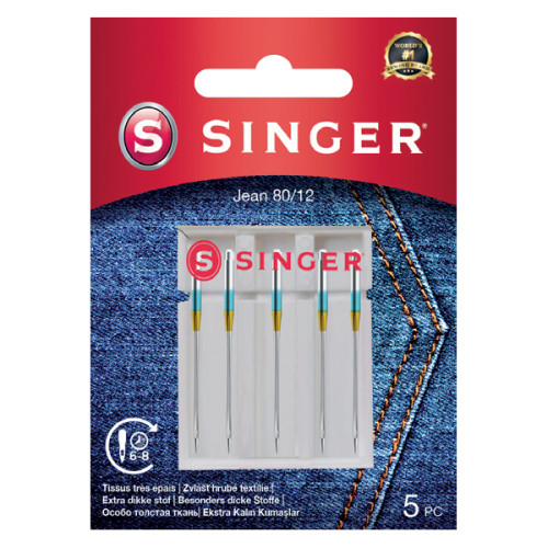 Jehly na džínovinu mají ostrou špičku a zesílené tělo jehly. Ta se díky tomu neláme a nepřeskakují stehy.