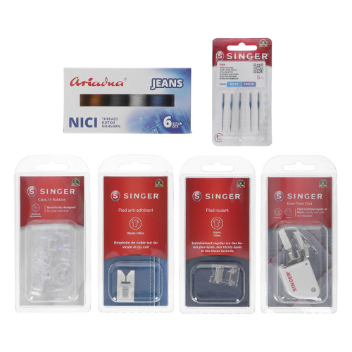 Zvýhodněná sada pro domácí šicí stroje. Vše co potřebujete, pokud budete šicí stroj používat při šití, nebo opravách džínsoviny, džínsových kalhot, riflí atd.