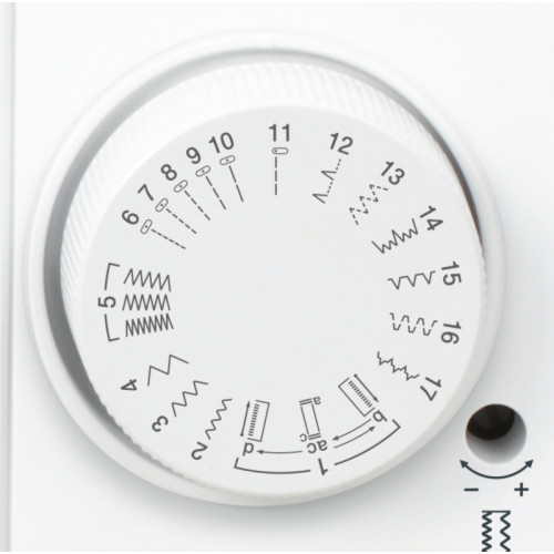 17 druhů stehů: rovné stehy v různých délkách, několik cik-caků, trojitý pružný cikcak steh, ozdobný steh