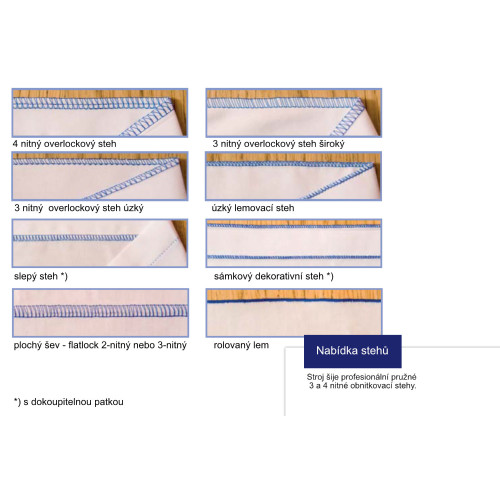 8 druhů stehů - Třínitné nebo čtyřnitné obnitkovací švy, flatlockový steh, rolované lemování