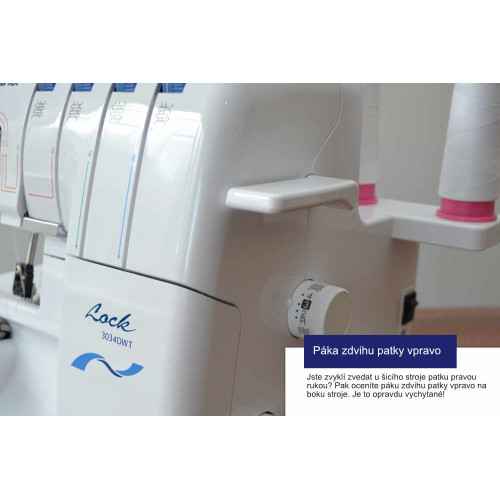 Páka na zdvih patky vpravo na boku stroje - budete patku zvedat pravou rukou, tak jako jste zvyklí u šicího stroje!