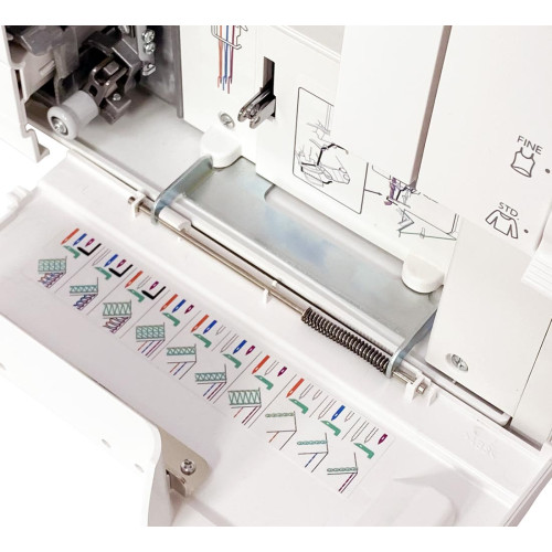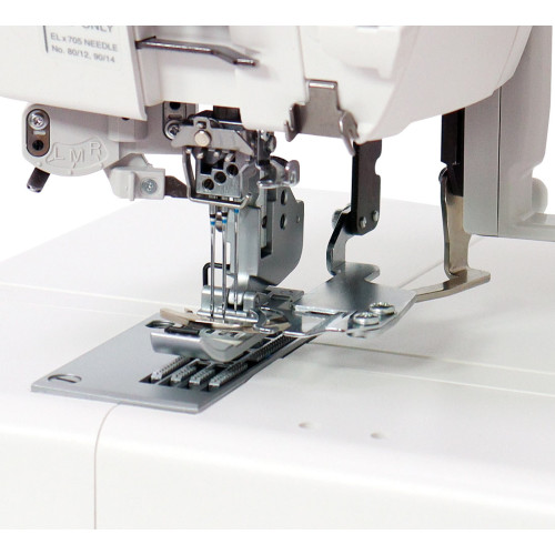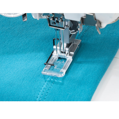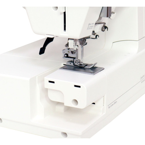 První v oboru! Vestavěný vodič stehu se snadno vyklopí na místo a poskytne vám trojitý nebo dvojitý horní krycí steh, který posune vaše dokončovací práce na profesionální úroveň.