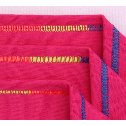 4. tříjehlový řetízkový steh se spodním krytím širší - navlékáte všechny jehly, navlékáte spodní chapač - steh se používá nejčastěji pro zakončení například triček, kdy z vrchní části vypadá jako trojjehla a spodní je pružný steh.