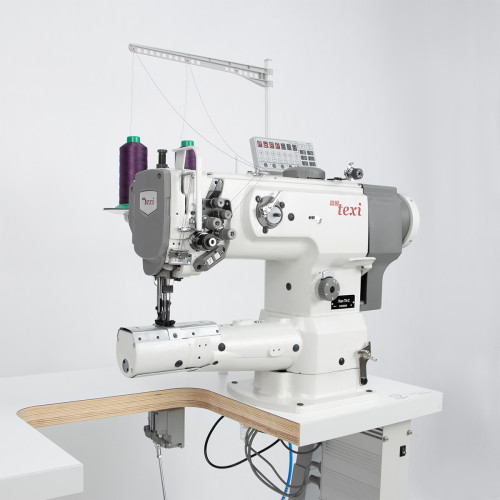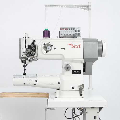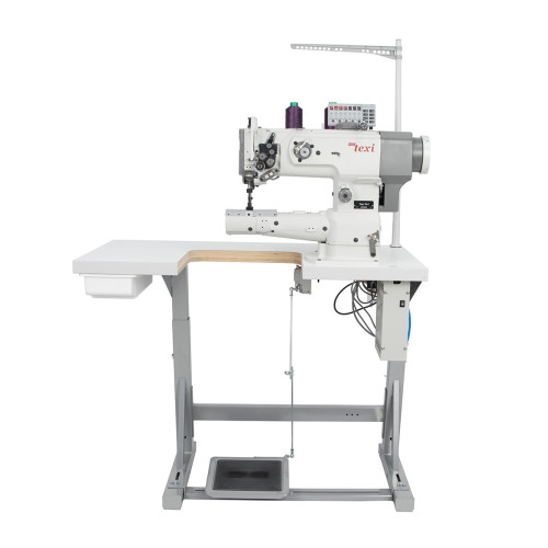 TEXI RAM C-A PREMIUM EX je 1jehlový ramenový šicí stroj s délkou ramene 255 mm pro šití těžkých materiálů s elektromagnetickým odstřihem, pneumatickým zdvihem patky, automatickým ryglováním, zapošitím, trojitým podáváním a extra velkým horizontálním chapačem XXL (cívka 26 mm).