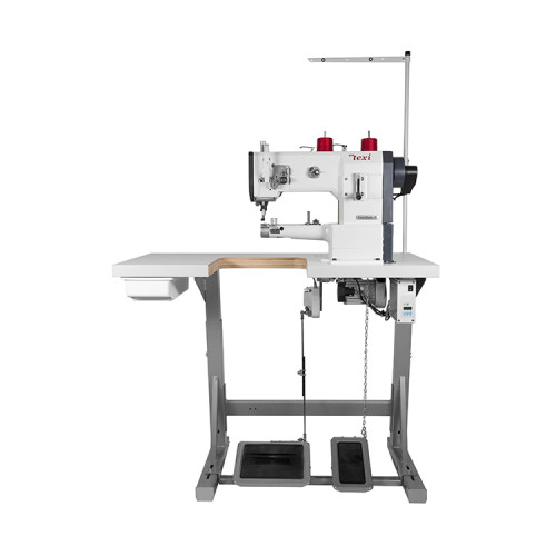 1jehlový šicí stroj s vázaným stehem s potrojným podáváním - spodní podávání, jehelní a patkové podávání a velkým chapačem (možnost použít nitě až 40/3). Součástí je AC servomotor 220-240 V, výkon 750 W a možnost nastavení jehelní pozice jehly (nahoře/dole).