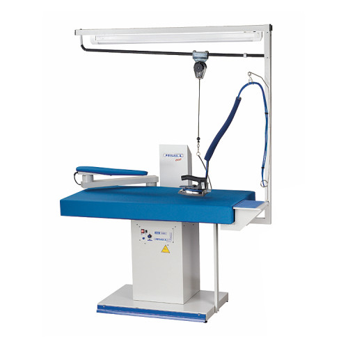 Žehlící stůl s typem desky 65 x 130 cm. Odsávání žehlící desky a rukávníku, ergonomická konstrukce, tichý chod, regulace teploty žehlící desky, rukávník, zavěšení žehličky, bezpečné nízkonapěťové ovládání 24 V, výška pracovní plochy 85 cm, napájecí napětí 230 V, výkon ventilátoru 0,37 kW, příkon vyhřívání žehlící desky 1 kW.