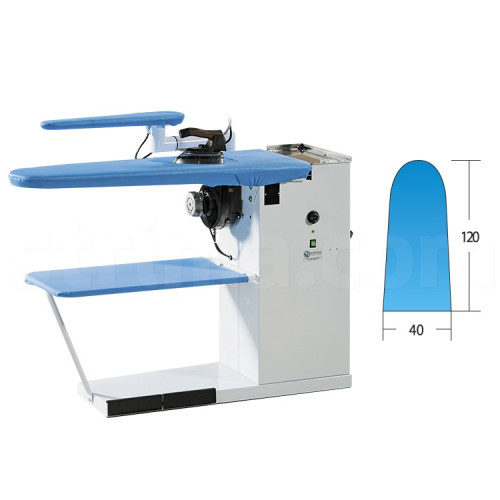 Žehlící prkno s typem desky 40x120 cm. Odsávání a ofuk z povrchu desky 0,37 kW, příkon vyhřívání povrchu desky 0,8kW, výška žehlící plochy 91cm, odsávaný a vyhřívaný rukávník 0,15kW, napájecí napětí 230V, váha 60 kg, rozměr stolu při práci 44x140x93 cm, objem v kartonu 0,7m3.