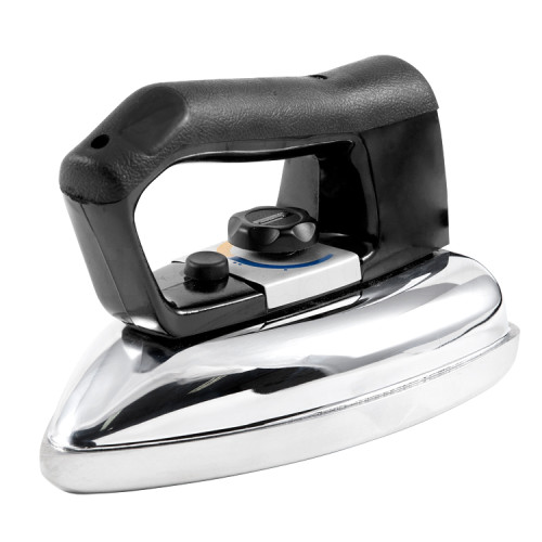 Ergonomická, průmyslová žehlička pro suché žehlení (bez páry) se speciální oblou špicí. Perfektní pro žehlení podšívek. Vyhřívání 900 W (230 V, 50 Hz), kvalitní držadlo, bimetalický termostat teploty (max. 215 °C), chránič ruky proti popálení, váha 1,7 kg.