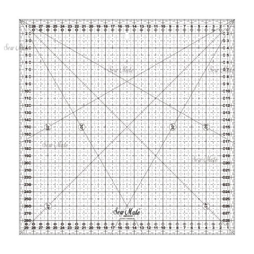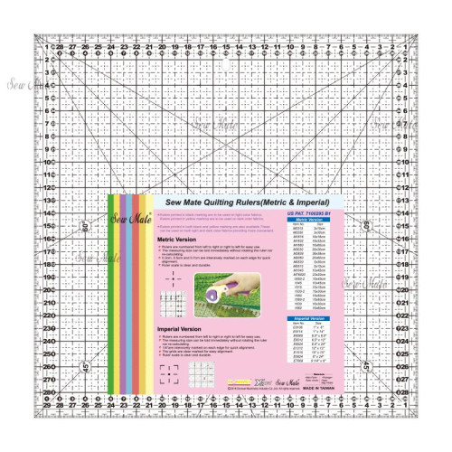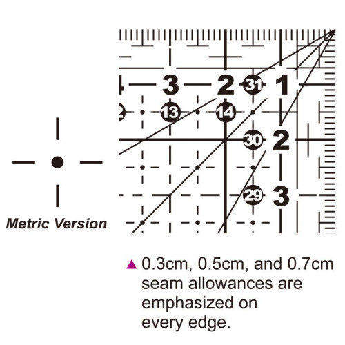 Metrická verze, číslování zleva doprava, nebo opačně. Naznačeny úhly 30, 45 a 60°. Upozorňujeme, že měření v cm je sice přehlednější a pokud využíváte předlohy českých prací, jsou stupnice v cm lepší, ale většina zahraničních prací je v inch. Zvažujte tedy jaké pravítko budete potřebovat, nebo objednávejte obě verze.