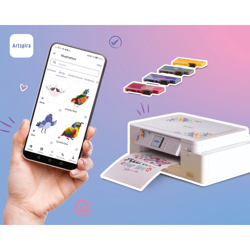 Brother SP-1 je kompatibilní s aplikací Artspira, která vám zajistí přístup k více než 100 návrhům zdarma. Získejte inspiraci, tvořte návrhy a přenášejte je přímo do tiskárny jediným kliknutím. Pokud vám to nestačí, můžete si předplatit Artspira+, kde získáte ještě více pokročilých funkcí a exkluzivních návrhů.