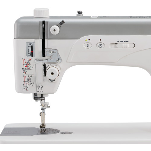 - Speciální konstrukce horního vodiče nitě, což znamená, že můžete šít nejen tenkými, ale i silnými nitěmi, a udržovat lepší vytvořený steh než kdykoli dříve (zvláště důležité při šití silnými nitěmi, např. u kůže, džín nebo gumy).