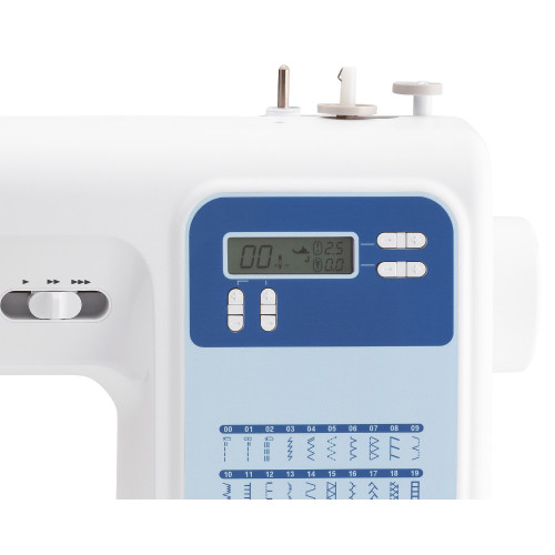 Na přehledném displeji stroje vidíte vybraný steh, doporučenou patku pro steh, zvolenou šířku i délku stehu. Pomocí tlačítek vedle displeje můžete steh, šířku i délku pohodlně a rychle nastavovat.