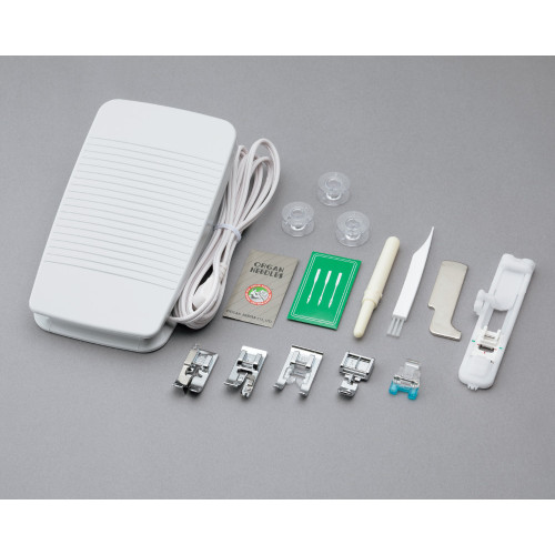 U stroje najdete bohaté příslušenství - 7 patek, se kterými ušijete téměř všechno, náhradní jehly, šroubovák, štěteček, páráček. Samozřejmostí je český návod, pedál a kabel.