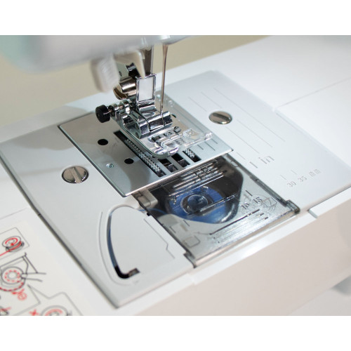 Stroj má moderní rotační chapač. Díky tomu je tichý, snadno se navléká i čistí. Navíc průhlednou krytkou vidíte, kolik nitě vám zůstává na cívce.