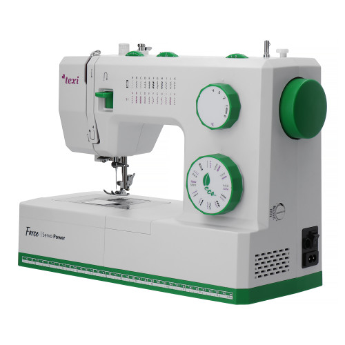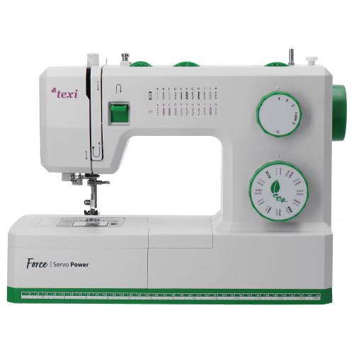Texi Force je revoluční domácí šicí stroj se silným AC servomotorem 100W - dříve používaný pouze v průmyslových strojích. Servomotor je více efektivní a má větší výkon odpovídající 100 W, což znamená nesrovnatelnou sílu a přesnost, zatímco více uspoříte na el. energii. Zaručuje hladké a stabilní šití na švech, záhybech a při spojování více vrstev látek. Umožňuje také plynulou změnu rychlosti šití, kdy dosahuje až 1000 stehů/min což je o 30% více, jako mají běžné stroje.