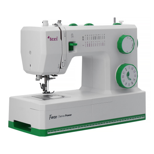 Šicí stroj Texi Force je v kategorii Heavy Duty silný mechanický šicí stroj s moderním designem, vhodný pro šití kůže, jeansů a jiných silných materiálů. Díky možnosti manuálního nastavení přítlaku patky, můžete ale šít i jemné materiály. Nabízí jednoduchou obsluhu, 23 druhů stehů, automatickou knoflíkovou dírku. Je vhodný zejména pro pokročilé švadleny. Šicí stroj je svou konstrukcí v řadě HD, vhodný pro větší zatížení a do dílen a malých provozoven.
