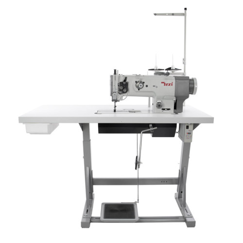 TEXI RAM PREMIUM EX je 1jehlový šicí stroj s délkou ramene 255 mm pro šití těžkých materiálů s trojitým podáváním a extra velkým horizontálním chapačem XXL (cívka 28 mm).
