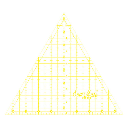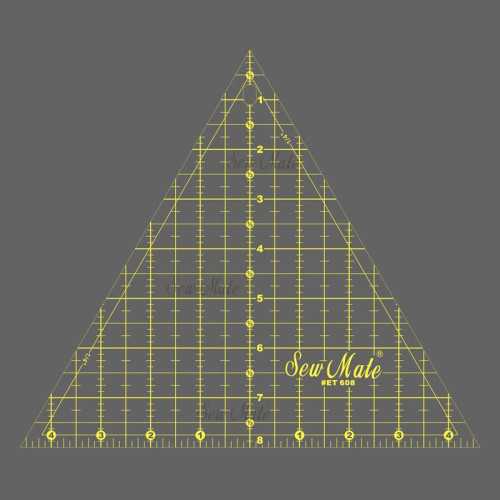 Pravítko trojúhelník o velikosti 9 1/4 x 8 palců (235 x 203 mm) se hodí pro měření a přesný řez čtverců, trojúhelníků a větších kusů. Hodí se také pro kontrolu přesné velikosti půlčtvercových trojúhelníků. Má měřítko v palcích. Číslování zleva doprava, nebo opačně. Naznačeny úhly 60°.