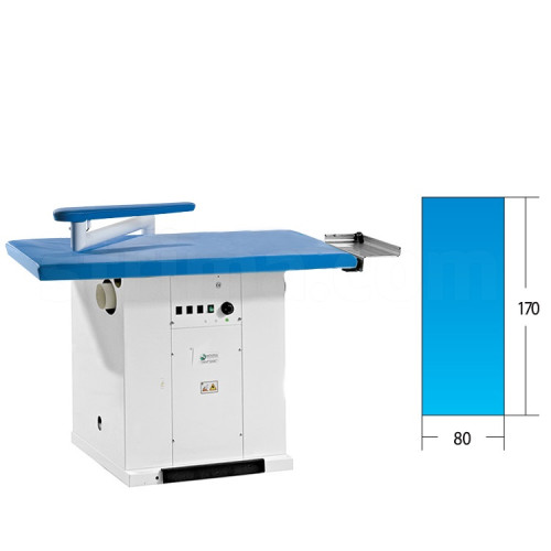 Žehlící stůl s typem desky 80x170 cm. Odsávání žehlící desky 0,37 kW, vyhřívání pracovní plochy, výška pracovní plochy 90cm, vyhřívaný a odsávaný rukávník 0,15 kW, napájecí napětí 230V, váha 81 kg, rozměr stolu při práci 82x192x95 cm, rozměr stolu v kartonu 1,7 m3.