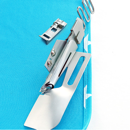 Zakladač pro našívání bočního lemu. Musíte mít paspuli o šíři 1 1/8" (28 mm), kterou zakladač zahne na 3krát na rozměr 3/8" (10 mm).